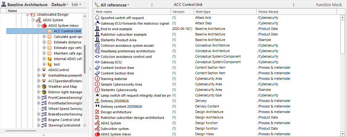 SystemWeaver is a collaborative environment. This means all items in the database can potentially be used or reused in any number of models in the database. Reusability is one of the strengths of SystemWeaver. The All references view lists all references to the item recursively. All References displays references to the item only, and looks for DefObj ("Defining Object") references as well as RefObj ("Referenced Object") references.